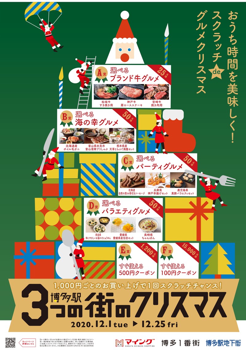 博多駅地下街、マイング、博多1番街のいずれかで、お買い物または、ご飲食されると1,000円ごとに「スクラッチカード」、500円ごとに「スクラッチ交換補助券」を進呈します。(「スクラッチ交換補助券」は2枚で「スクラッチカード」と交換可能)